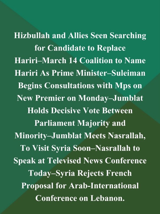 [Download] "Hizbullah and Allies Seen Searching for Candidate to Replace Hariri--March 14 Coalition to Name Hariri As Prime Minister--Suleiman Begins Consultations with Mps on New Premier on Monday--Jumblat Holds Decisive Vote Between Parliament Majority and Minority--Jumblat Meets Nasrallah, To Visit Syria Soon--Nasrallah to Speak at Televised News Conference Today--Syria Rejects French Proposal for Arab-International Conference on Lebanon (Lebanon-Politics)" by Lebanon) The Daily Middle East Reporter (Beirut # eBook PDF Kindle ePub Free